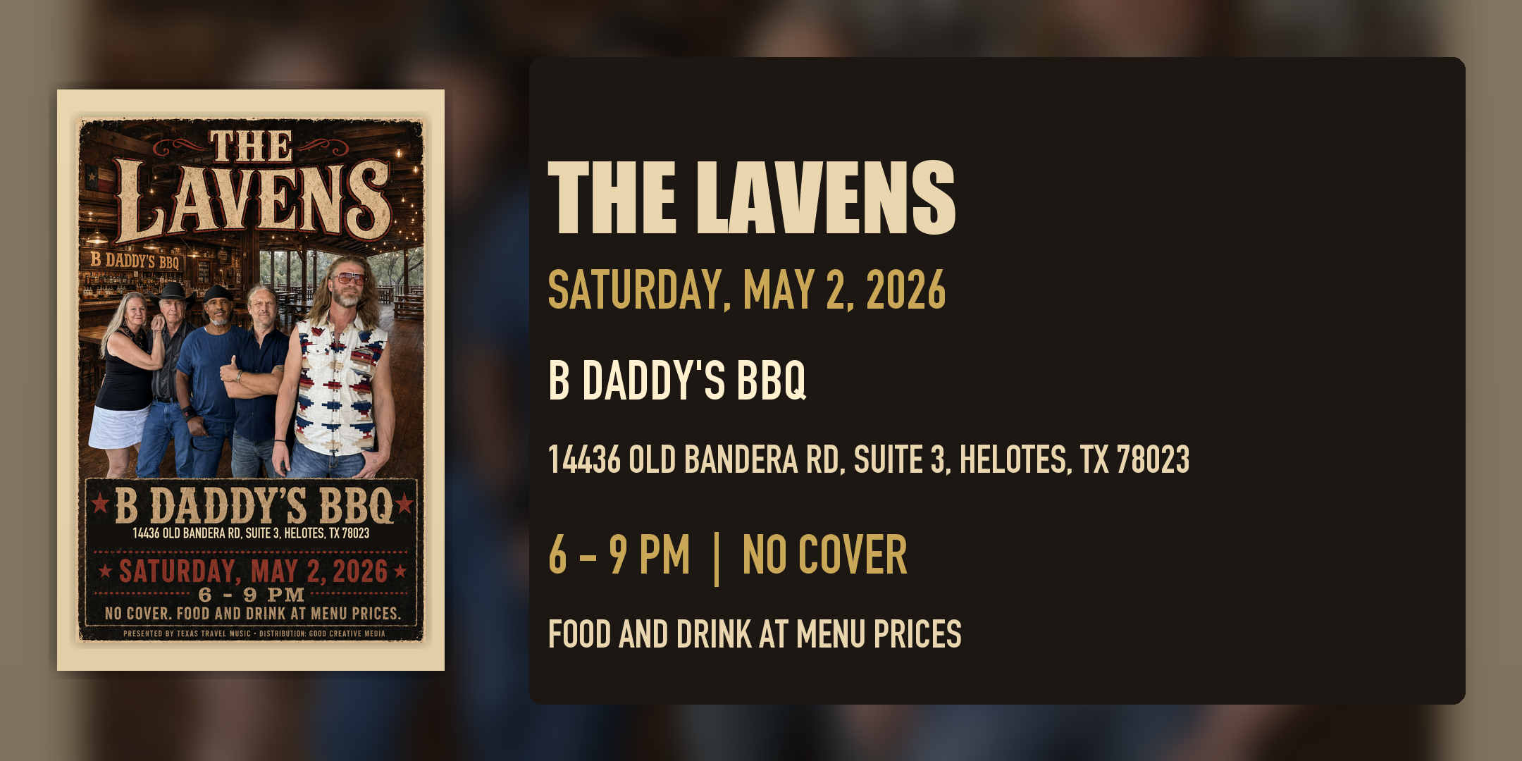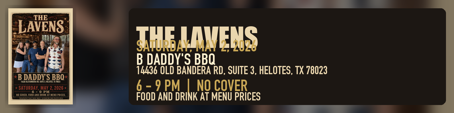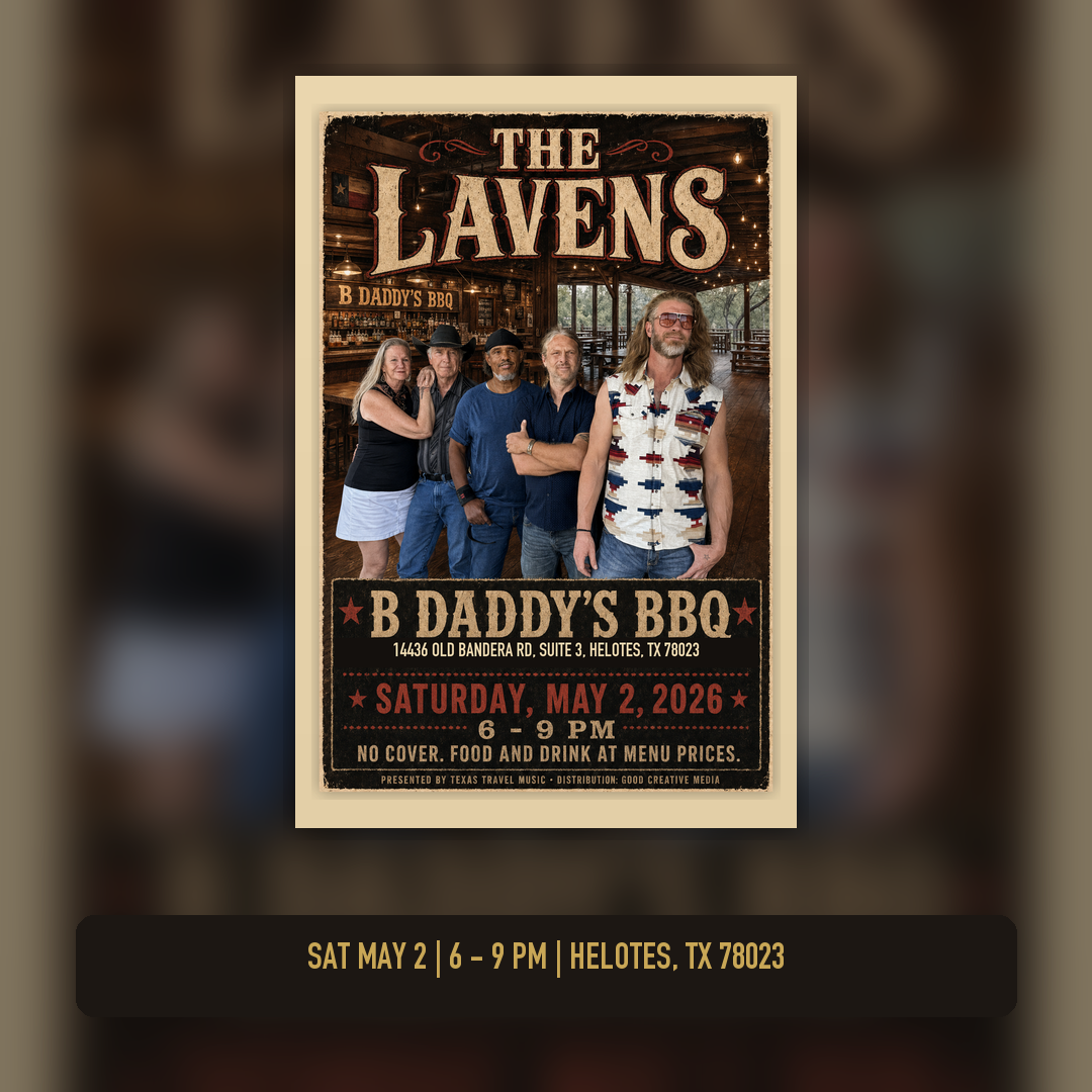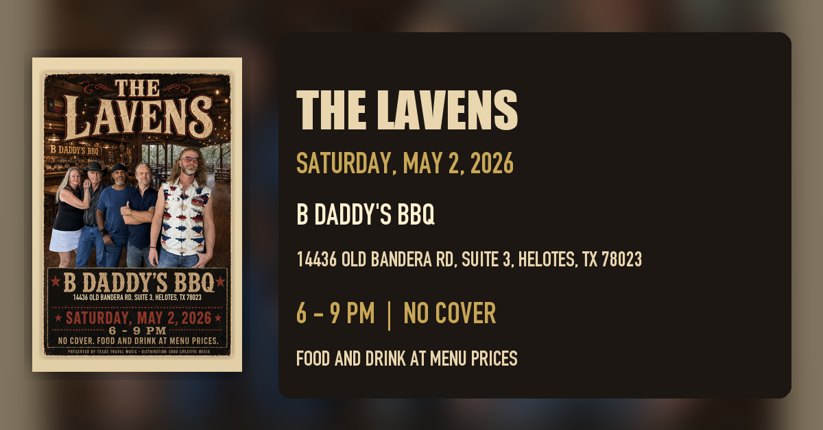 **HELOTES, TX - April 29, 2026.** On Saturday, May 2, The Lavens play a three-hour, no-cover set at B Daddy's BBQ, the Old Town Helotes barbecue room known for Texas wood-smoked brisket, homemade mac and cheese, borracho beans, hardwood floors, and a saloon-style bar. The show runs from **6:00 to 9:00 PM** at **14436 Old Bandera Rd, Suite 3, Helotes, TX 78023**.