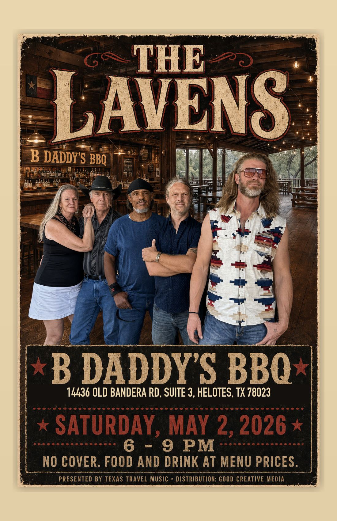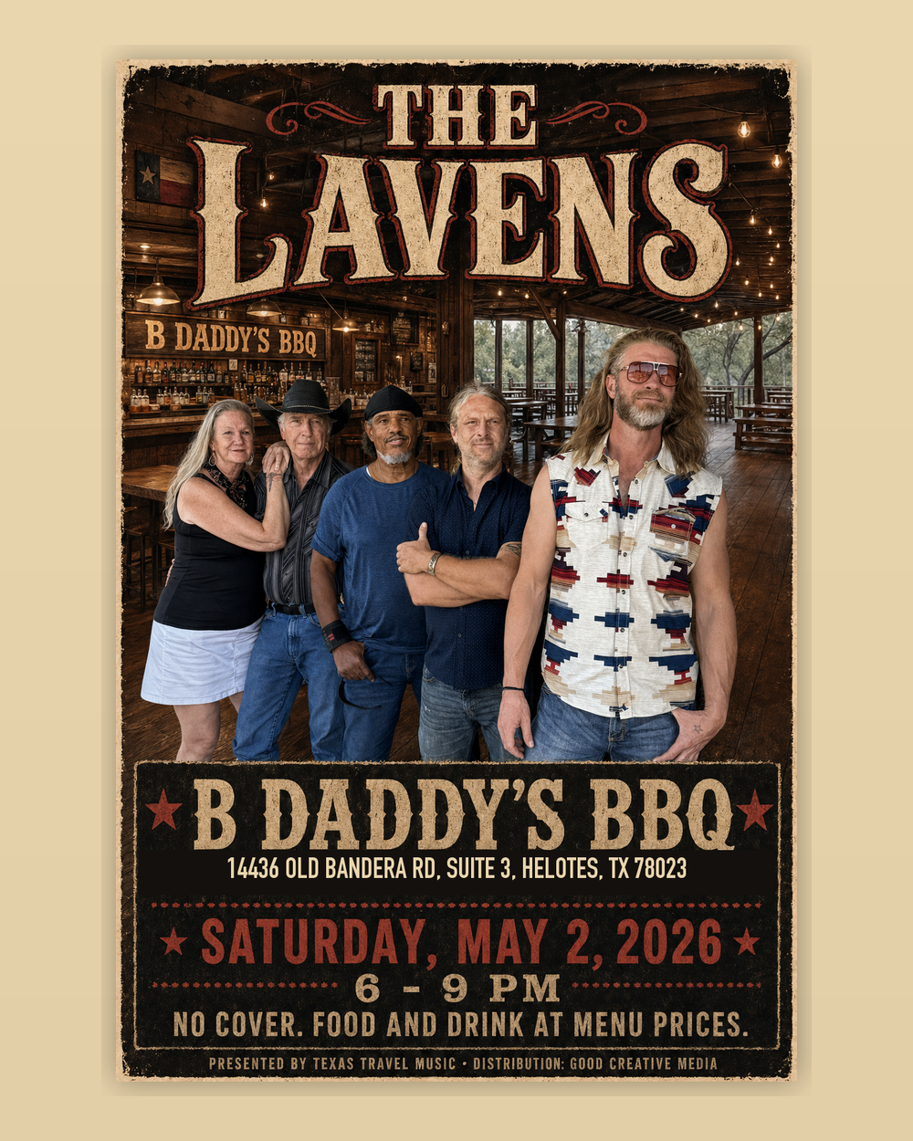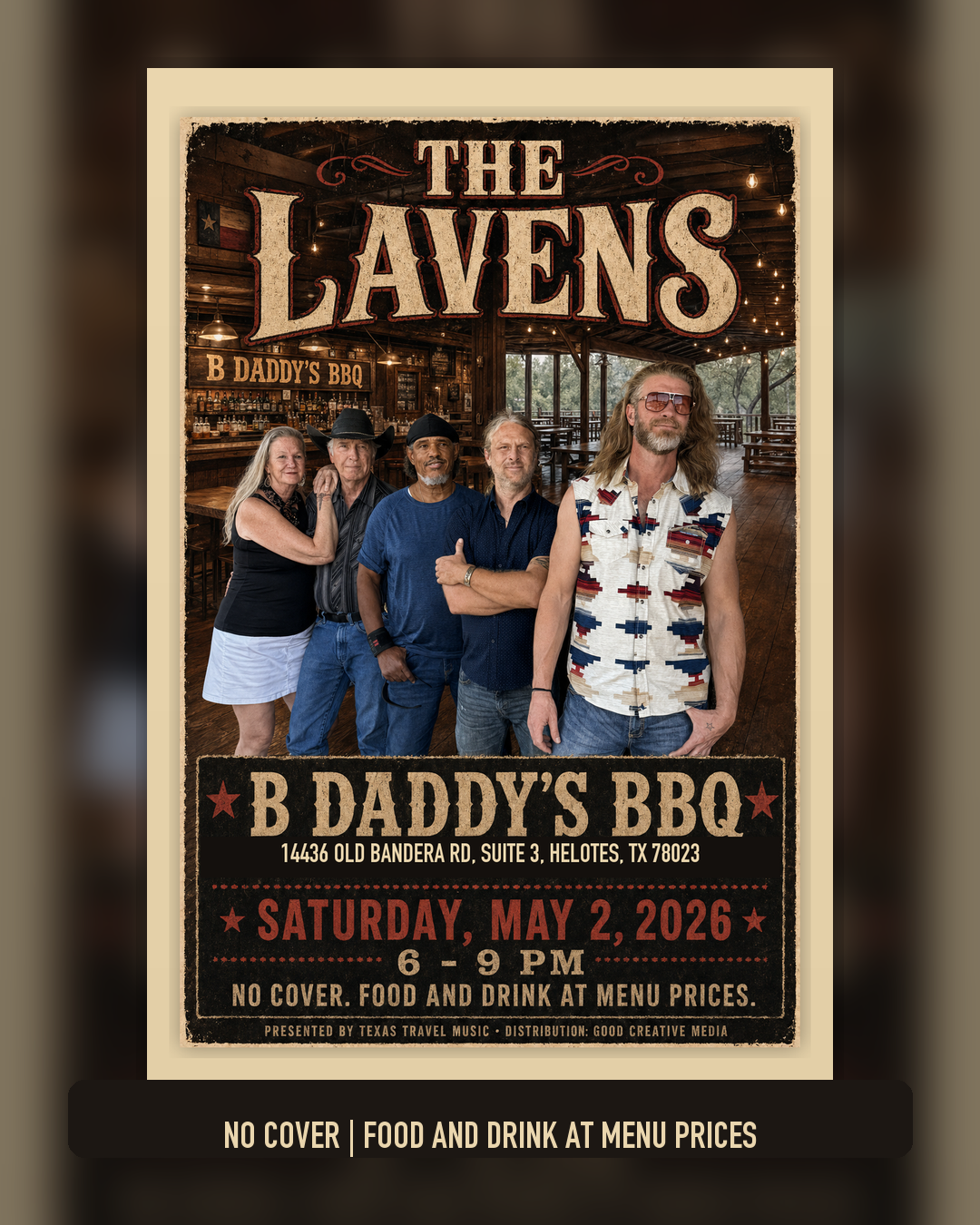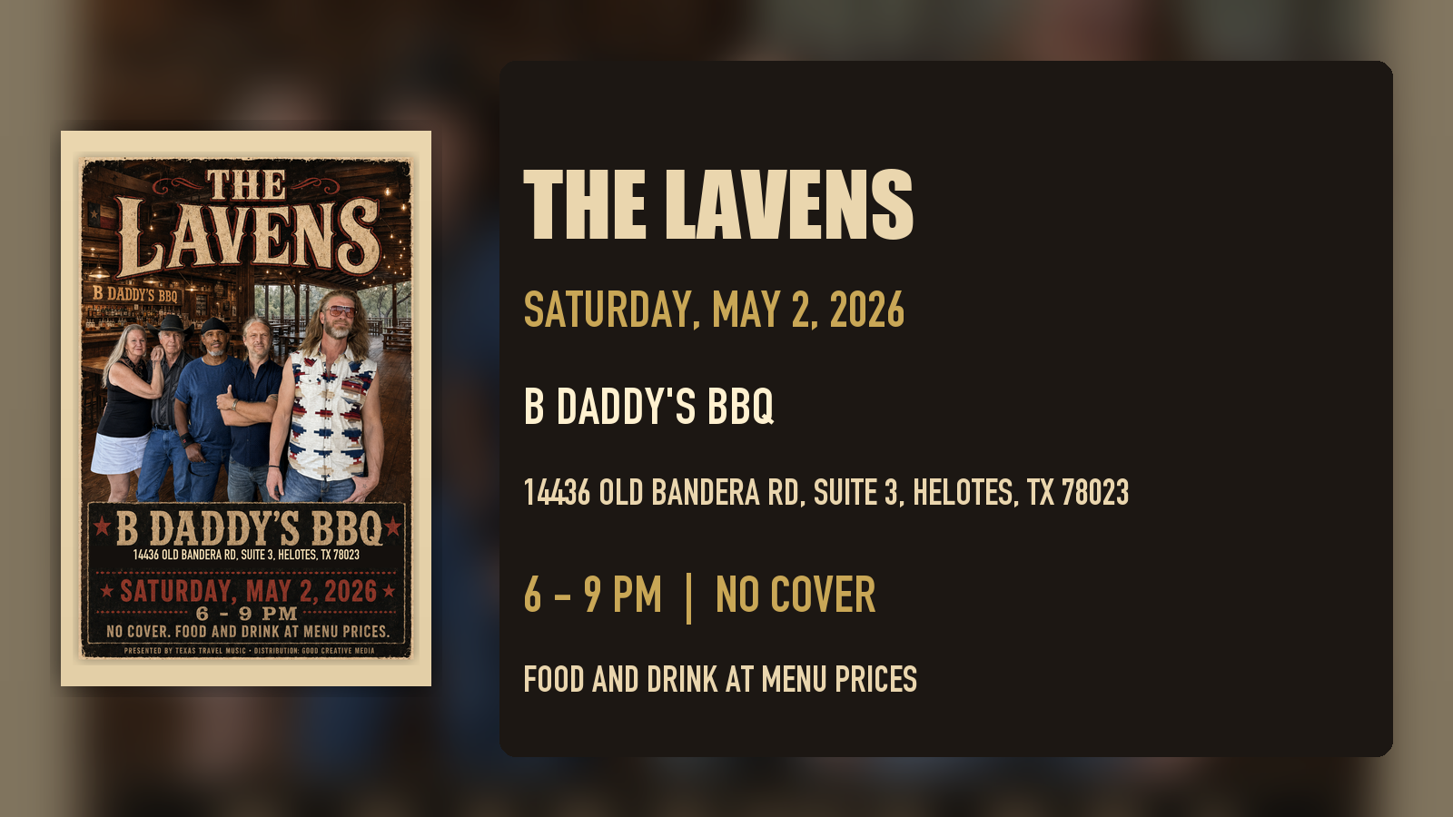 **HELOTES, TX - April 29, 2026.** On Saturday, May 2, The Lavens play a three-hour, no-cover set at B Daddy's BBQ, the Old Town Helotes barbecue room known for Texas wood-smoked brisket, homemade mac and cheese, borracho beans, hardwood floors, and a saloon-style bar. The show runs from **6:00 to 9:00 PM** at **14436 Old Bandera Rd, Suite 3, Helotes, TX 78023**.
