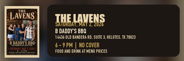 The Lavens at B Daddy's BBQ, Helotes. Sat May 2, 6-9 PM. No cover for the music; food/drink at menu prices. RSVP: [link]