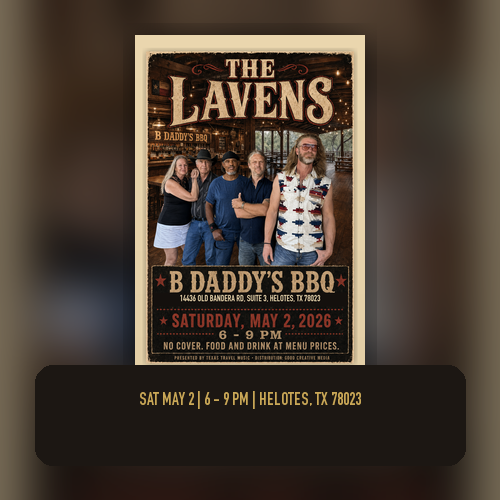The Lavens play B Daddy's BBQ in Old Town Helotes on Saturday, May 2, 2026, from 6:00 to 9:00 PM.